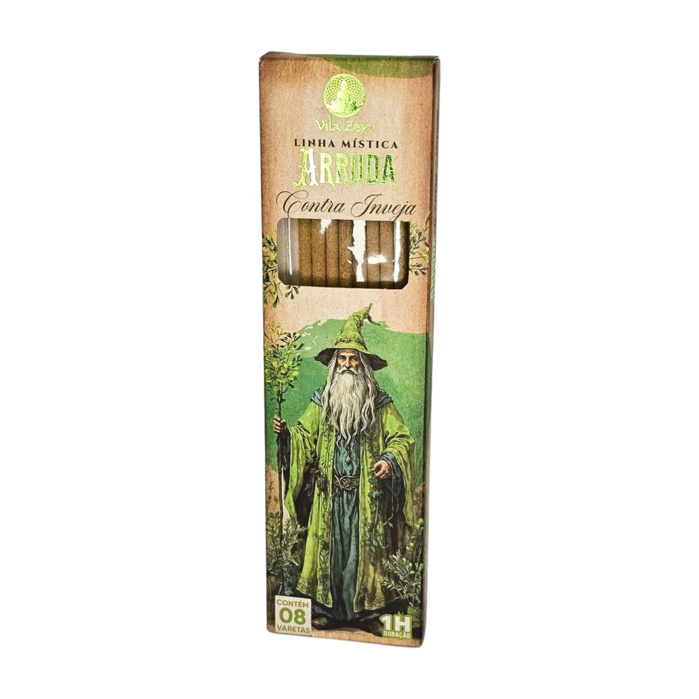 Composição: Madeira reflorestada, farinha de coco, amido, pó de Arruda, breu branco, ervas aromaticas e resinas.